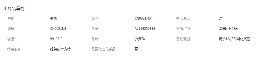CN9021 NS丙烯酸酯產(chǎn)品描述CN9021 NS 用于UV/EB 固化層壓膠及壓敏膠配方。可提供良好的附著力,柔韌性及耐水性,特別對(duì)于玻璃材料。產(chǎn)品特征對(duì)玻璃附著力高伸長(zhǎng)率耐濕產(chǎn)品性質(zhì)良好的附著力良好的耐水性高伸長(zhǎng)率柔韌性好建議應(yīng)用層壓材料壓敏膠CN9021 NS 典型物理和化學(xué)性質(zhì)外觀清澈液體顏色,APHA100粘度,厘泊 @60℃
